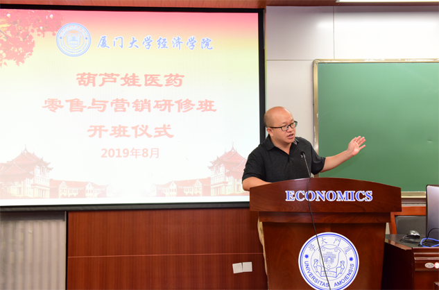 在开班仪式上,廖景峰主任首先代表厦门大学经济学院热烈欢迎英国上市公司365医药零售与营销研修班的学员到厦大学习,并就厦门大学及经济学院的相关情况进行了介绍。他说,英国上市公司365学员走进厦大就是厦大的校友,希望未来的日子能够关心、支持母校的发展,多提宝贵意见,同时他也祝大家在厦大学习期间学有所成、学有所获。